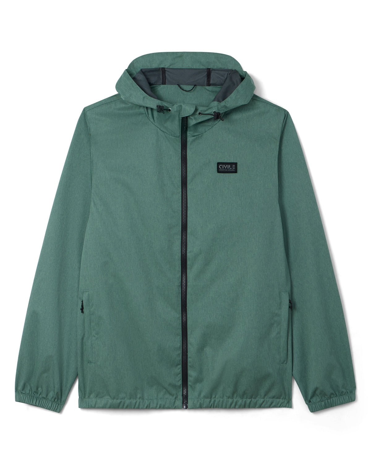 • Tech hooded rain jacket with, side zip pockets, rubberized zipper head