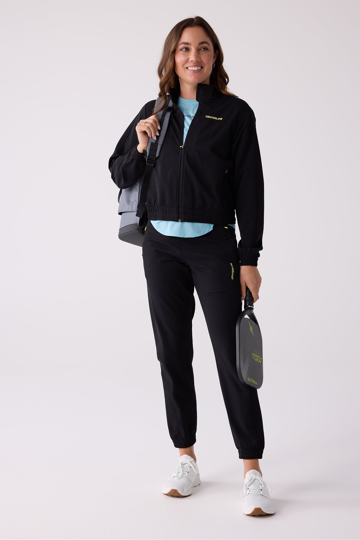 The ultimate post-game track jacket, designed with a soft and comfortable, stretch woven fabric. Secure front hand pockets, with a secure phone storage option on the right hand side, and a discreet front chest drop pocket to allow you to easily store your sunglasses, adding practicality to this street-style piece that easily transitions from the pickleball court to casual activities.